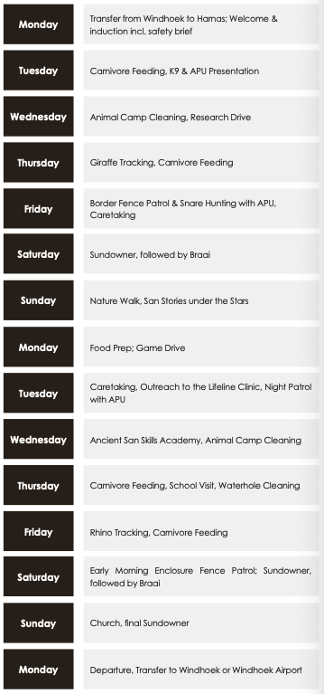 Legg merke til at dette kun er et eksempel og at det kan hende aktiviteter blir flyttet rundt på. Du vil få oppdatert informasjon om oppsettet fra din prosjektkoordinator i løpet av oppholdet i Namibia.